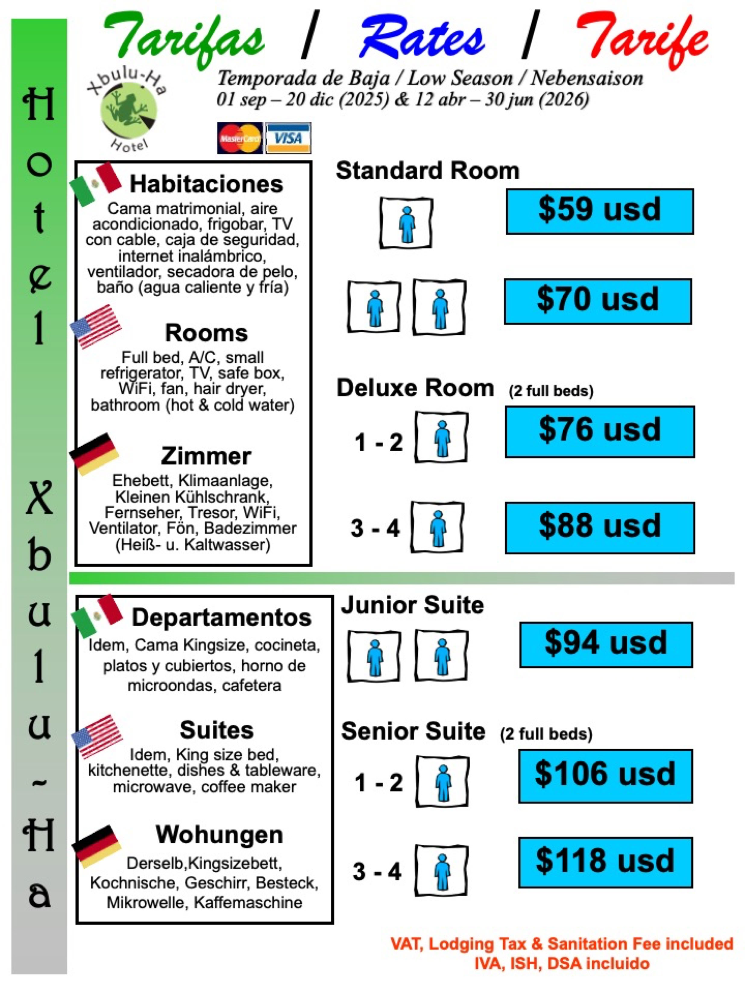 Las tarifas de las habitaciones son por noche. El IVA, ISH y DSA (derecho de saneamiento ambiental) ya están incluidos.